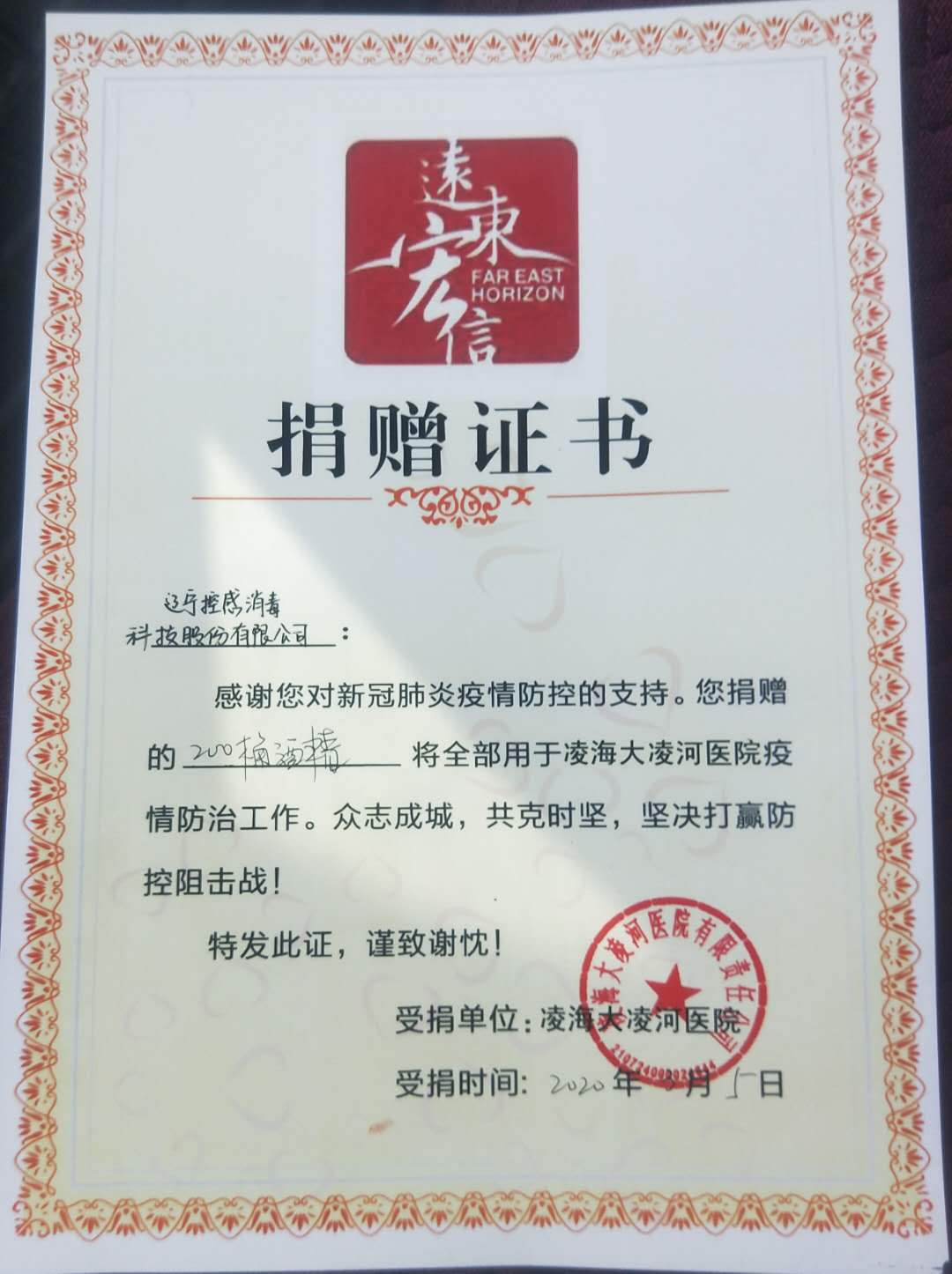 3月2日,3月5日公司向錦州市傳染病醫院和凌海大凌河醫院捐獻賑災物資,以用于支持新型冠狀病毒肺炎疫情的防控。