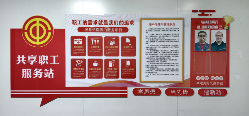 11月25日,公司第一個共享職工服務站在包裝中心成立并投入使用。共享職工服務站文化墻上醒目地提示著共享服務項目、使用管理辦法,為了豐富文化墻內容,還增添了“與榜樣同行遇見更好的自己”優秀員工光榮榜。共享職工服務站內共享物品齊全,擺放整齊,共享設施設備即符合藥企規范,也充滿溫馨,充滿愛意。服務站提供的服務項目包括:1、愛心服務柜。愛心服務柜備用日常應急藥品,以備不時之需;包裝中心員工每天高效、重復的包裝動作很容易被包材劃傷手部,愛心服務柜為包裝崗位員工配備了處理傷口的藥品和防護用品。2、公用雨傘。雨雪天氣,為特殊需要的員工提供共享雨傘。3、白鋼洗手池+熱水器+洗手液。洗手池帶有冷、熱水調節開關,讓員工在寒冷的天氣里,能夠使用溫水洗手,暖手暖心。4、洗手烘干機。員工進入操作間洗手后及時烘干,確保員工衛生安全。5、酒精手消毒機。包裝人員在進入包裝間前雙手要進行酒精消毒,以保證衛生,同時防止交叉感染和病從手入。6、多層水杯柜+保溫杯。為每一名員工配備了大容量保溫杯,統一存放在多層水杯柜中,根據姓名、編號,員工可以快捷地找到自己的水杯,為員工喝熱水提供方便,環境也更加美觀整潔。7、手指套+手套。服務站為常年進行手工操作的包裝人員配備了手指套和手套特殊的勞保用品,保護員工減少手部磨損和受傷。8、立式手機充電站+多孔插排。方便員工各種品牌、型號的手機充電需要。