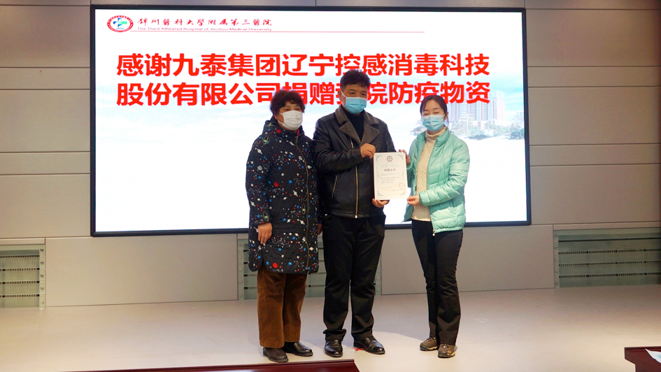 2月11日、25日,錦州九泰集團積極踐行企業社會責任,向錦州醫科大學附屬一院和附屬三院開展愛心捐贈活動,送去75%乙醇消毒液,有效緩解了新型冠狀病毒疫情防控物資匱乏壓力,發揮了積極的作用。對打贏新型冠狀病毒疫情阻擊戰提供了物資保障。
